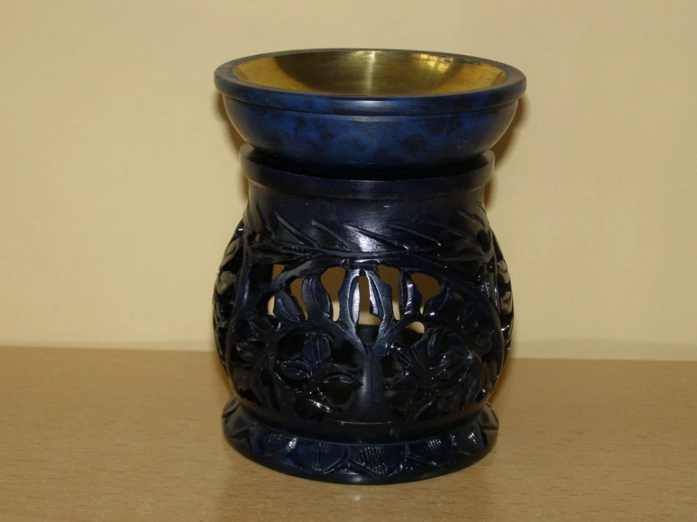 Bohatě vyřezávaná aromalampa na čajovou svíčku a aromaolej je ručně vyrobena z mastku, jednoho z nejměkčích kamenů. Miska na aromatickou kapalinu je vyložena mosazí, aby se zabránilo případnému prosakování kapaliny kamenem. Aromalampa je barevně upravená a tvoří praktický doplněk moderního interiéru.