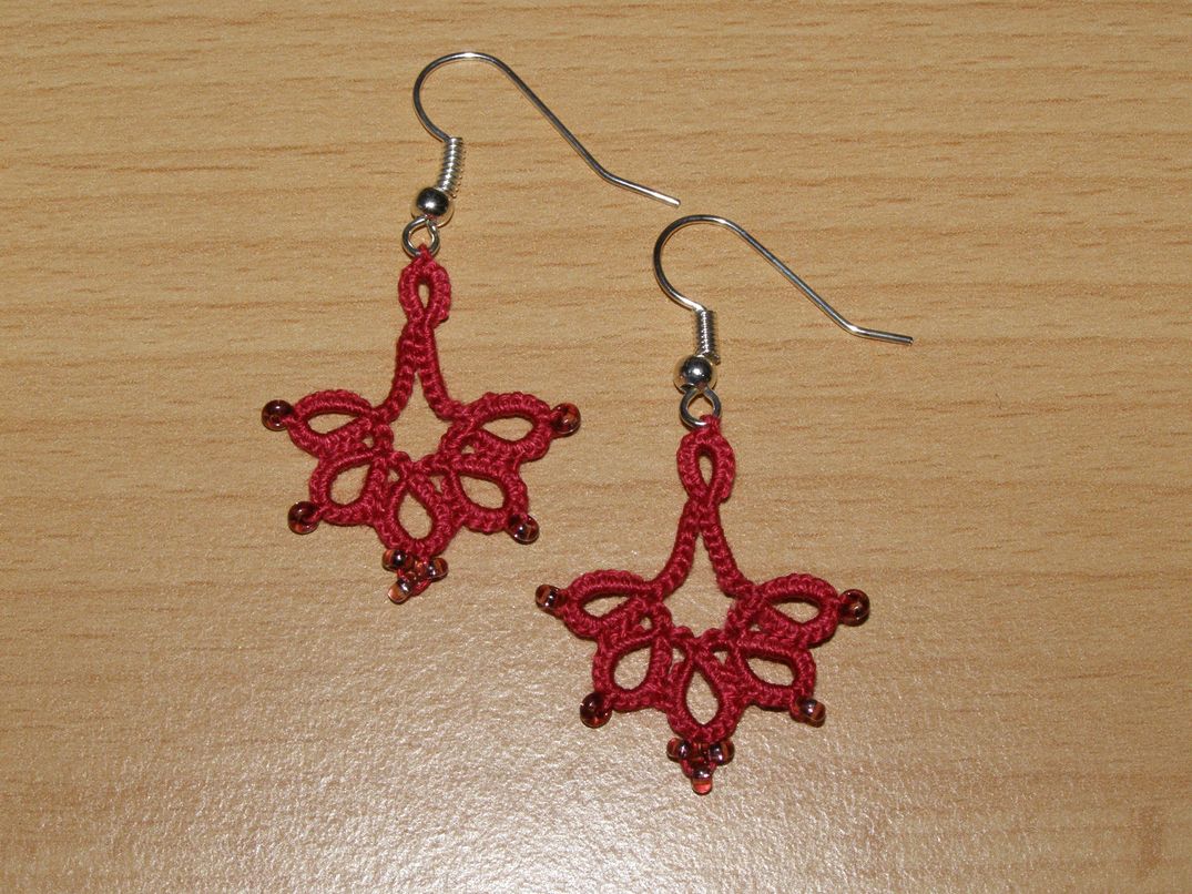Náušnice - krajka - délka 2,5 cm (měřeno bez závěsu, pouze motiv), barva vínová, ruční práce.