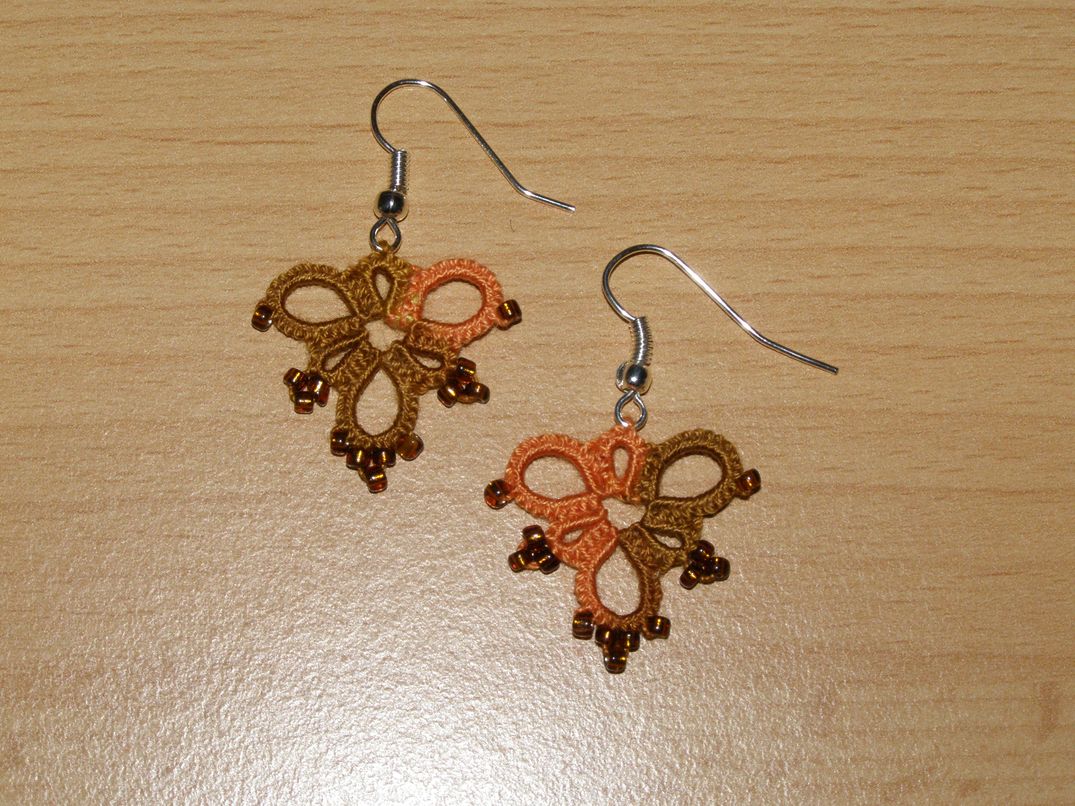 Náušnice - krajka - délka 2,3 cm (měřeno bez závěsu, pouze motiv), barva hnědo-oranžovo-žlutá (příze melír), ruční práce.