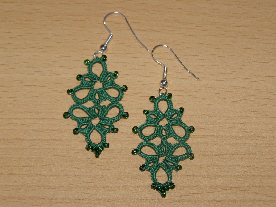 Náušnice - krajka - délka 4 cm (měřeno bez závěsu, pouze motiv), barva tmavě zelená, ruční práce.