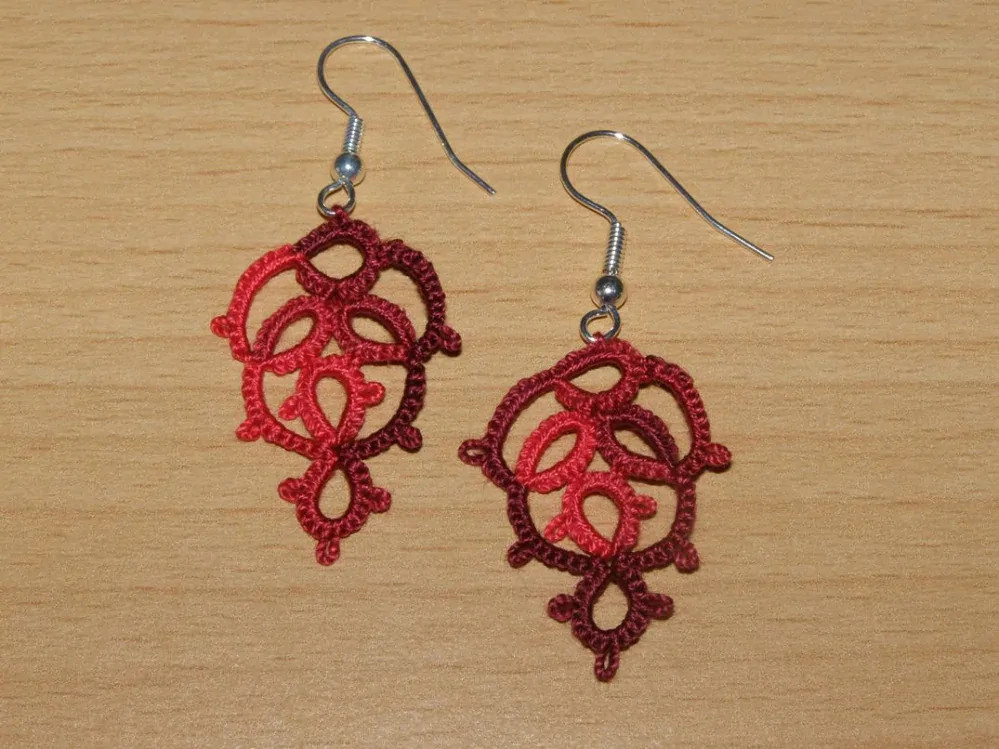 Náušnice - krajka - délka 3 x 2,2 cm (měřeno bez závěsu, pouze motiv), barva červená melír, ruční práce.