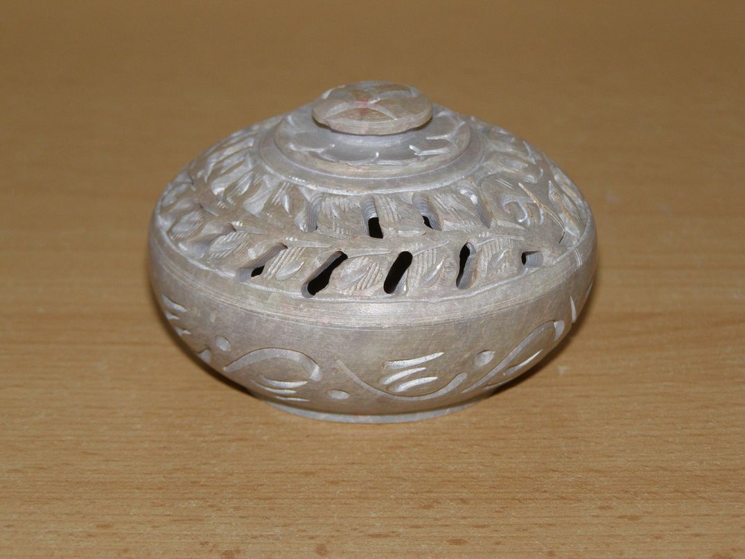 Víceúčelová dózička, lze použít nejen jako šperkovnici, ale po otočení víčka získáte stojánek na vonné tyčinky. Ručně vyřezáno z přírodního mastkového kamene. Ruční práce, každý kus je originál.