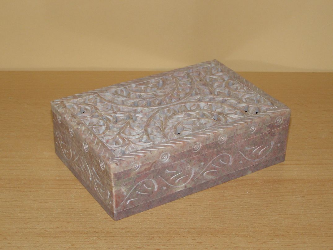 Šperkovnice z mastku s bohatě vyřezávaným víkem. Ruční práce, každý kus je originál.