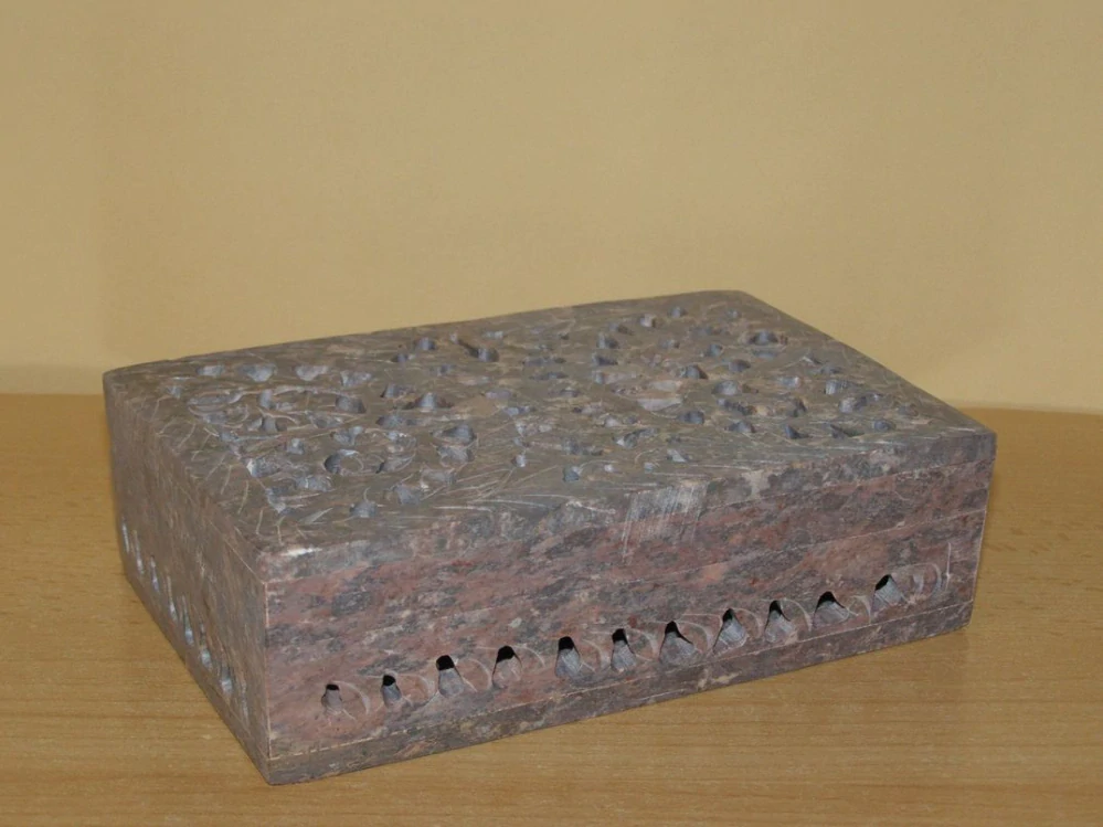 Šperkovnice z mastku s bohatě vyřezávaným víkem. Ruční práce, každý kus je originál.
