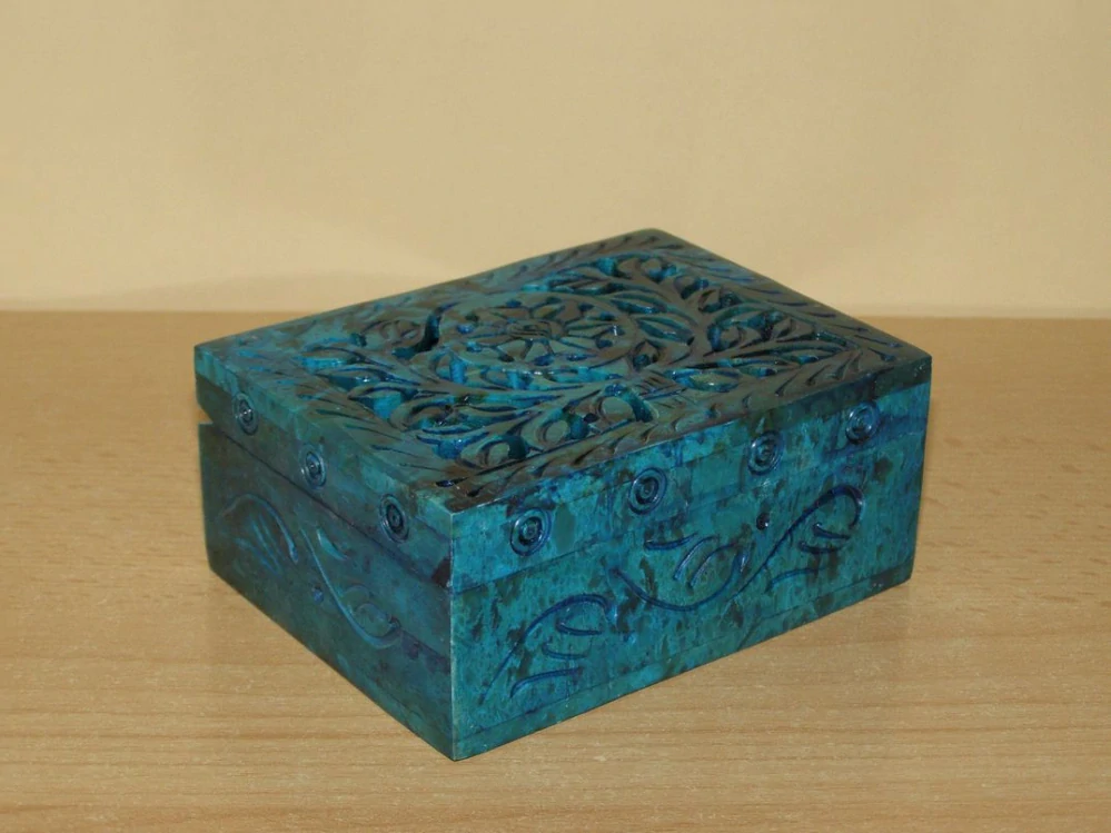 Šperkovnice z mastku s bohatě vyřezávaným víkem. Ruční práce, každý kus je originál, barevně upravená.