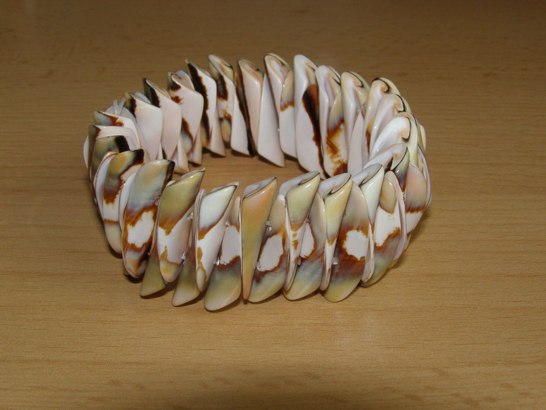 Pružný náramek skládaný - mušle, šířka 27 mm, vnitřní obvod cca 16 - 17 cm.