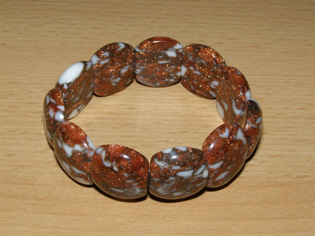 Pružný náramek - sluneční kámen (syntet.) mramor - ploché obdélníčky 20 x 18 mm, vnitřní obvod cca 17-18 cm.