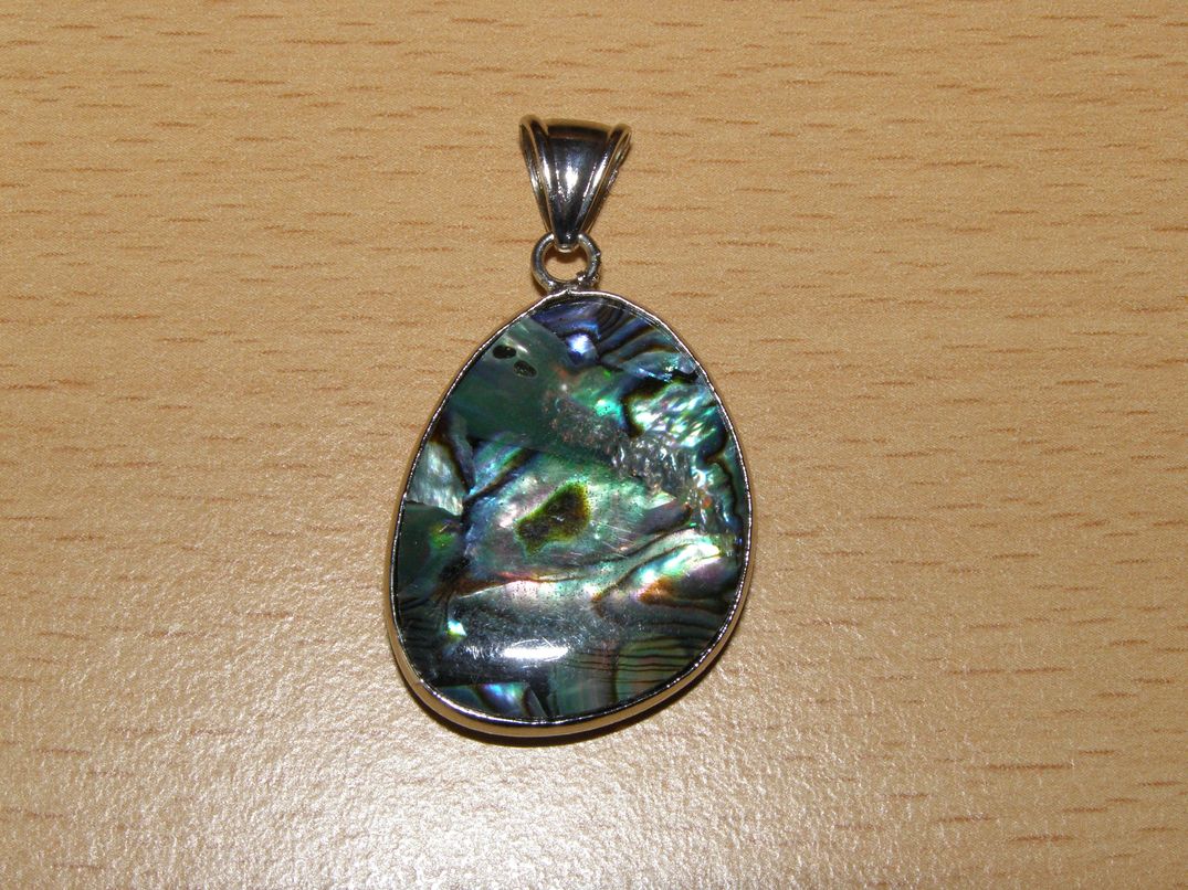 Přívěsek - paua mušle (Nový Zéland) - nepravidelný tvar, oboustranný, v kovovém rámečku, velikost 20 x 30 mm (měřeno bez závěsného očka).