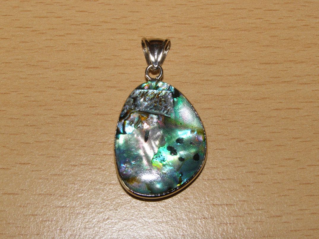 Přívěsek - paua mušle (Nový Zéland) - nepravidelný tvar, oboustranný, v kovovém rámečku, velikost 20 x 30 mm (měřeno bez závěsného očka).