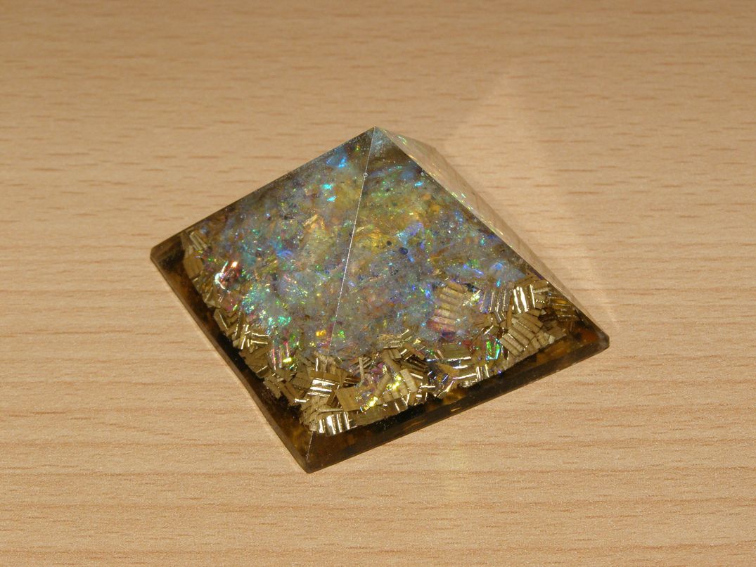 Těžítko - orgonit - pyramida (efekt měsíční kámen) - základna 38 mm, výška 28 mm.
