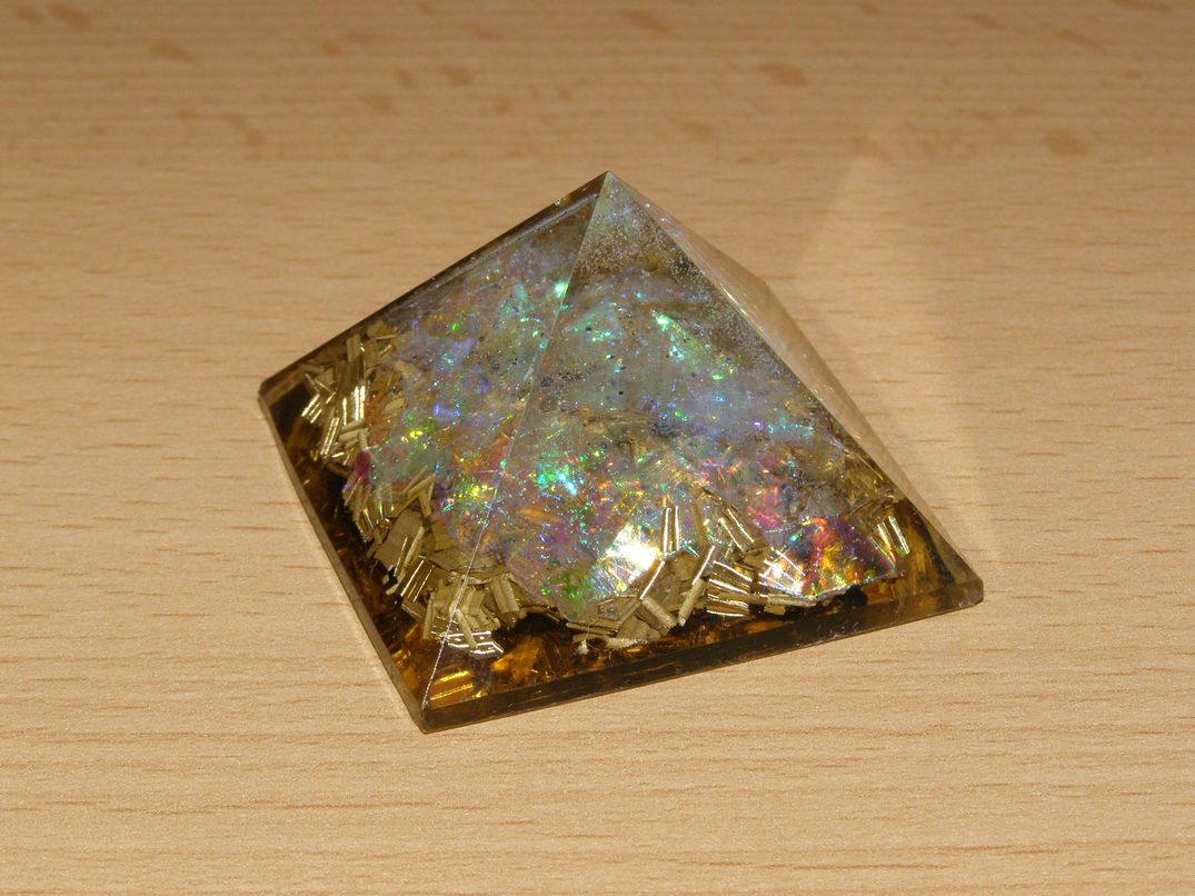Těžítko - orgonit - pyramida (efekt měsíční kámen) - základna 38 mm, výška 28 mm.
