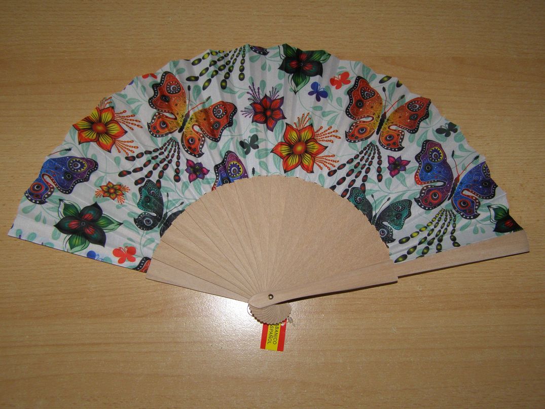 Vějíř z nelakovaného dřeva a textilu - Barevní motýlci.