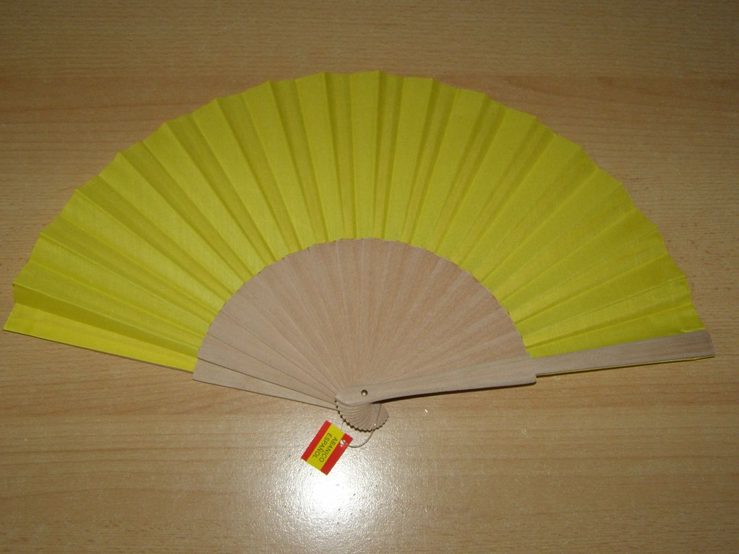 Vějíř z nelakovaného dřeva a textilu - žlutý.