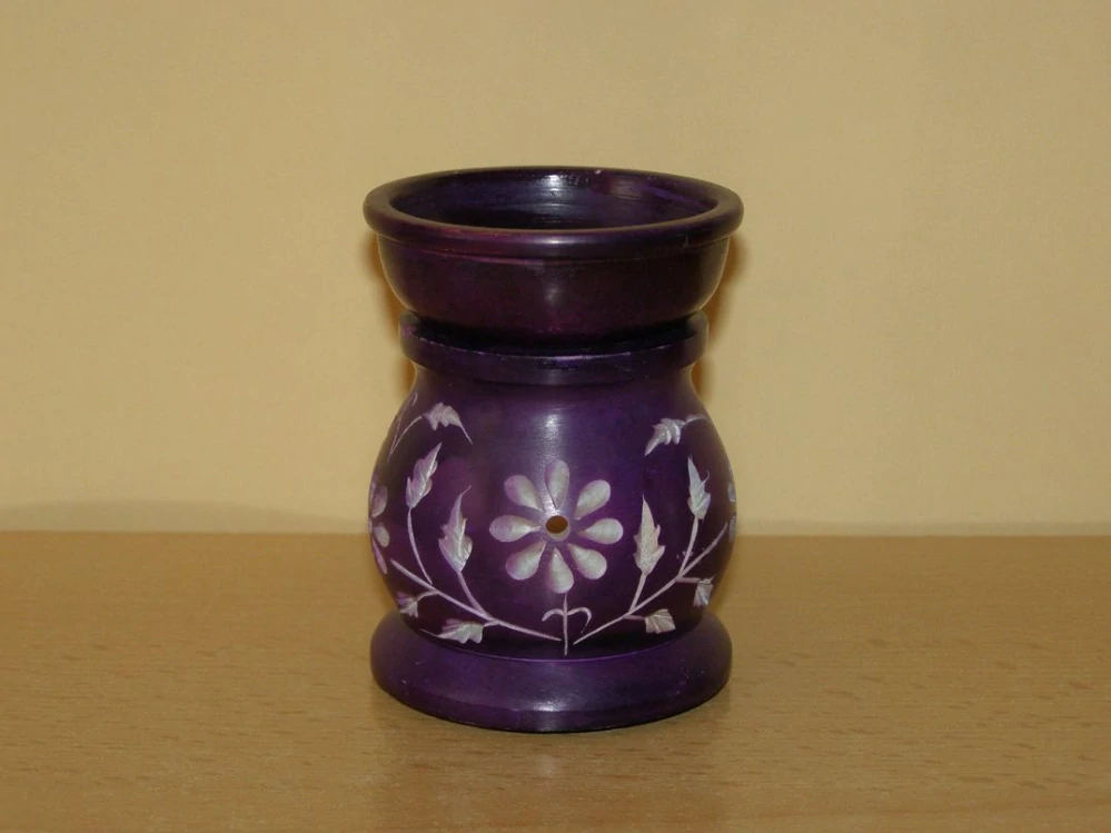 Ručně vyřezávaná aromalampa na čajovou svíčku a aromaolej s motivem květin. Vyřezáno z mastkového kamene, ruční práce, každý kus je originál. Barva fialová.