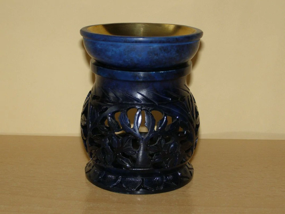 Bohatě vyřezávaná aromalampa na čajovou svíčku a aromaolej je ručně vyrobena z mastku, jednoho z nejměkčích kamenů. Miska na aromatickou kapalinu je vyložena mosazí, aby se zabránilo případnému prosakování kapaliny kamenem. Aromalampa je barevně upravená a tvoří praktický doplněk moderního interiéru.