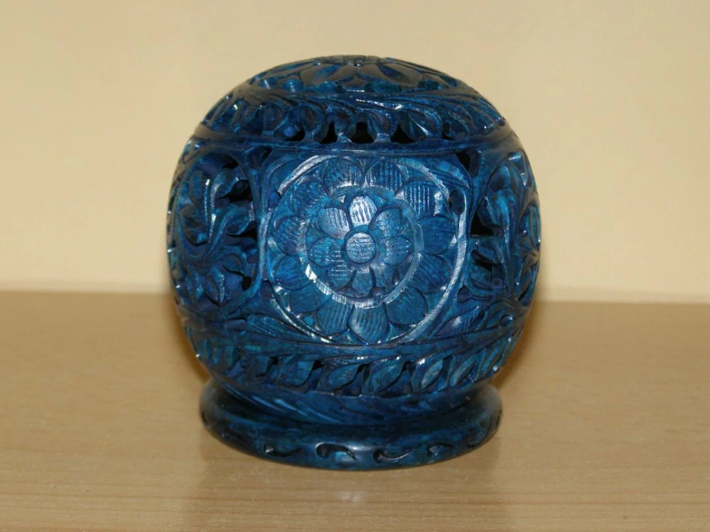 Bohatě vyřezávaný svícen na čajovou svíčku je ručně vyroben z mastku, jednoho z nejměkčích kamenů. Svícen je povrchově barevně upraven - modrá.