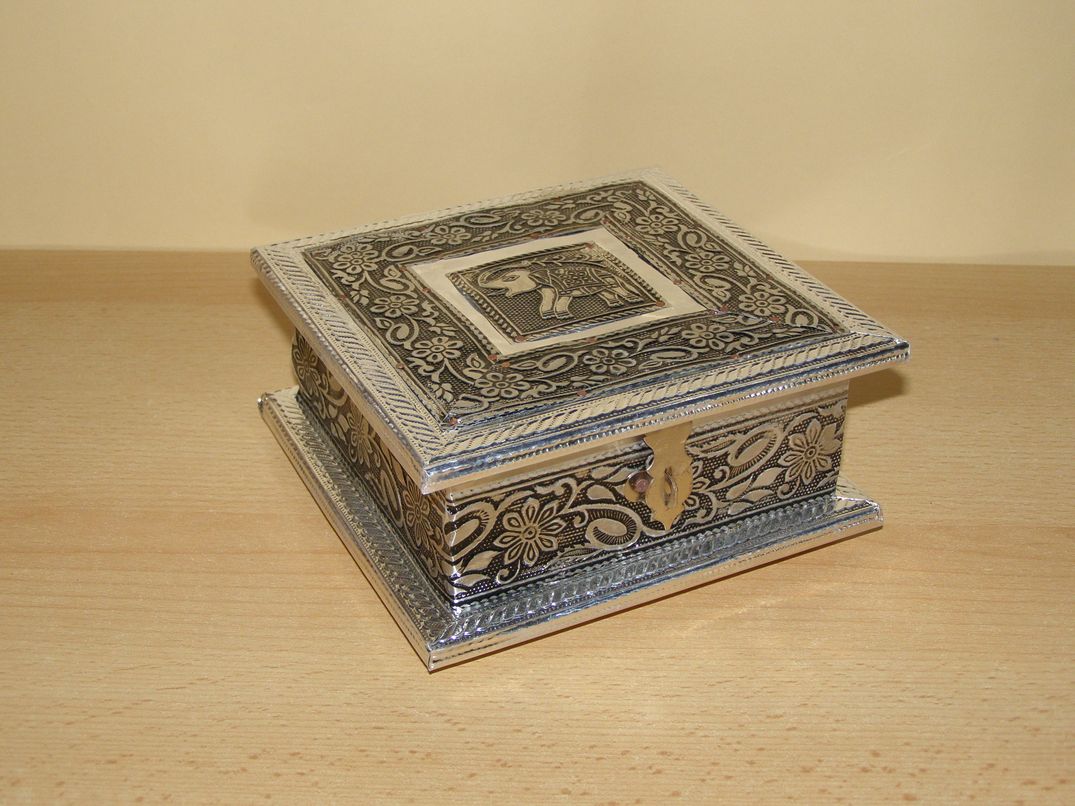Ozdobná tepaná šperkovnice, stříbrný kov zdobený květinovým motivem a slonkem. Ruční výroba.