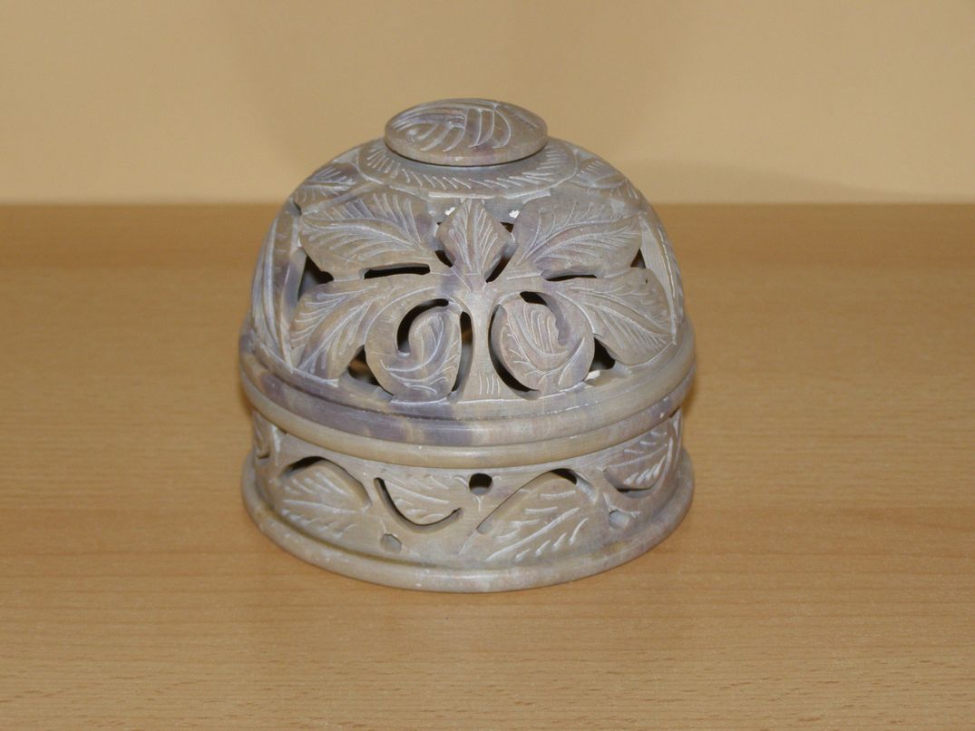 Dekorativní vyřezávanou dózu lze použít nejen jako šperkovnici, ale také jako dózu na pot-pourri. Otočením víčka získáte stojánek na vonné tyčinky. Vyřezáno z mastkového kamene, ruční práce, každý kus je originál.