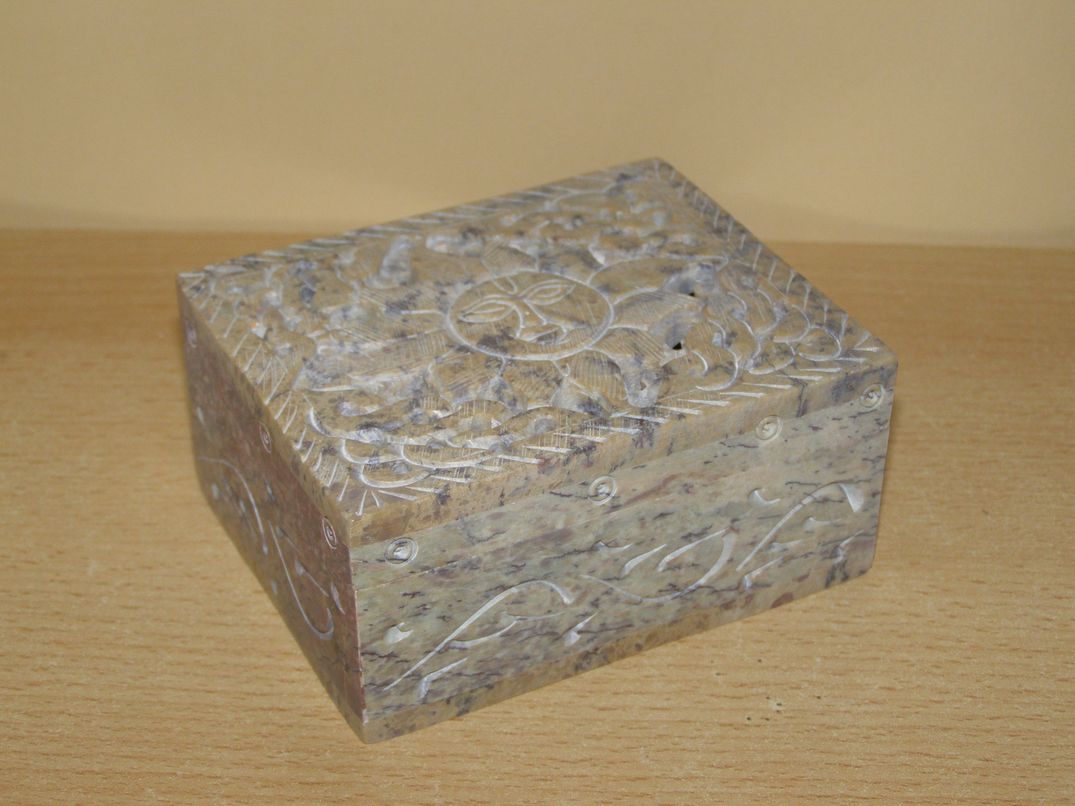 Šperkovnice z mastku s bohatě vyřezávaným víkem. Ruční práce, každý kus je originál.