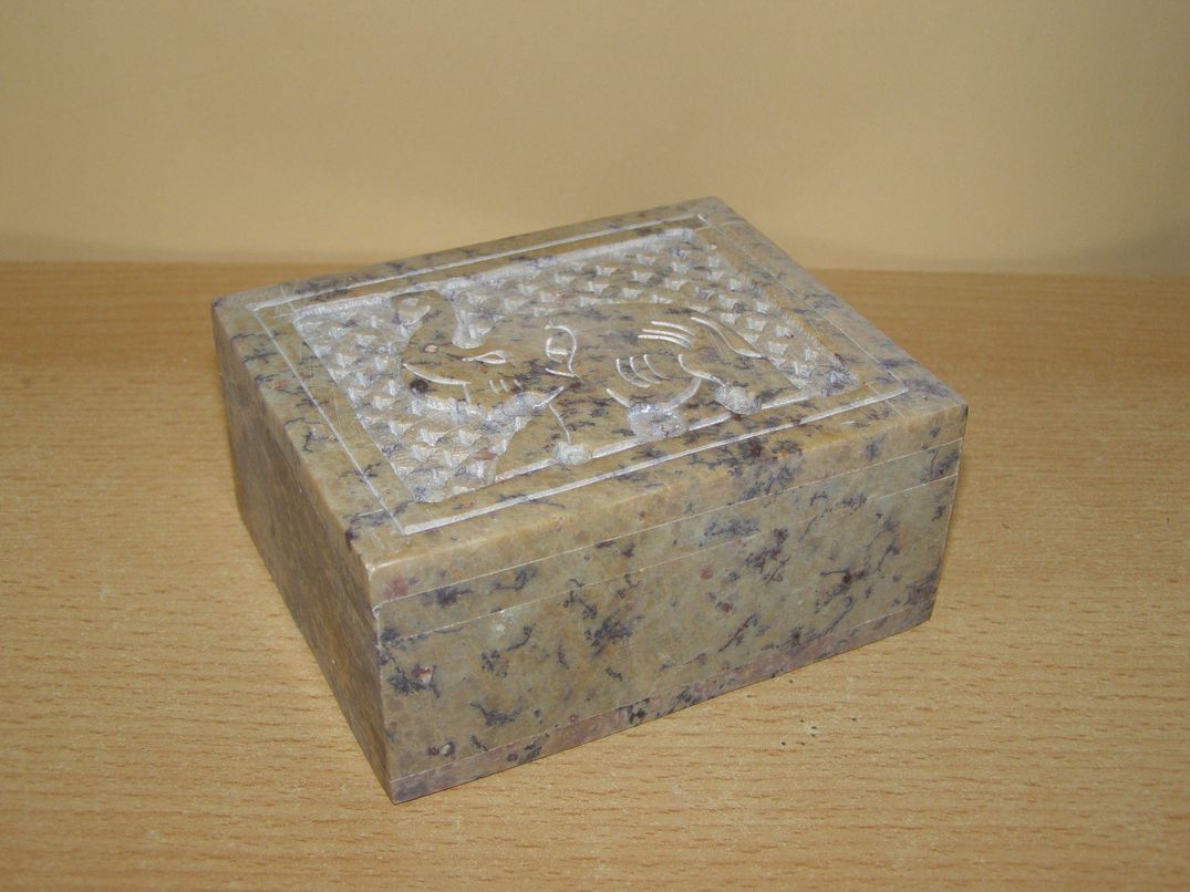 Šperkovnice z mastku s bohatě vyřezávaným víkem. Ruční práce, každý kus je originál.