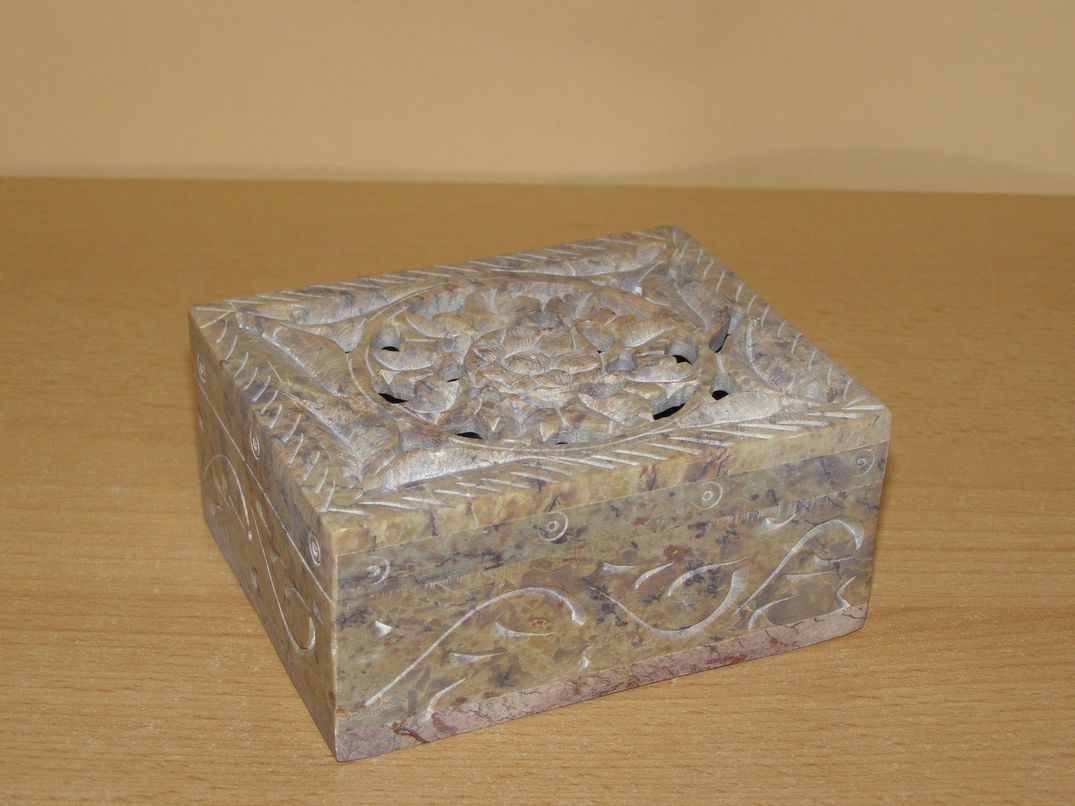 Šperkovnice z mastku s bohatě vyřezávaným víkem. Ruční práce, každý kus je originál.