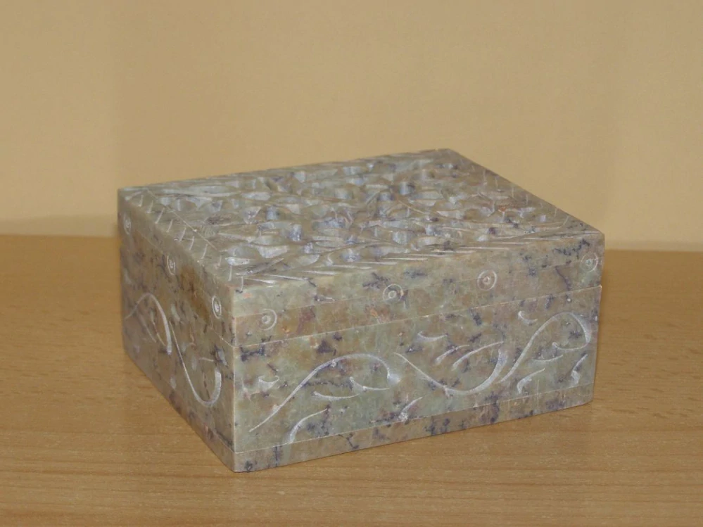 Šperkovnice z mastku s bohatě vyřezávaným víkem. Ruční práce, každý kus je originál.